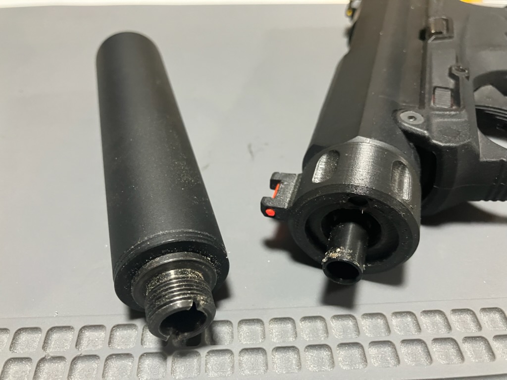 アウターバレルとネジが別パーツなので、サプレッサーを緩めるとネジごと取れてきます。